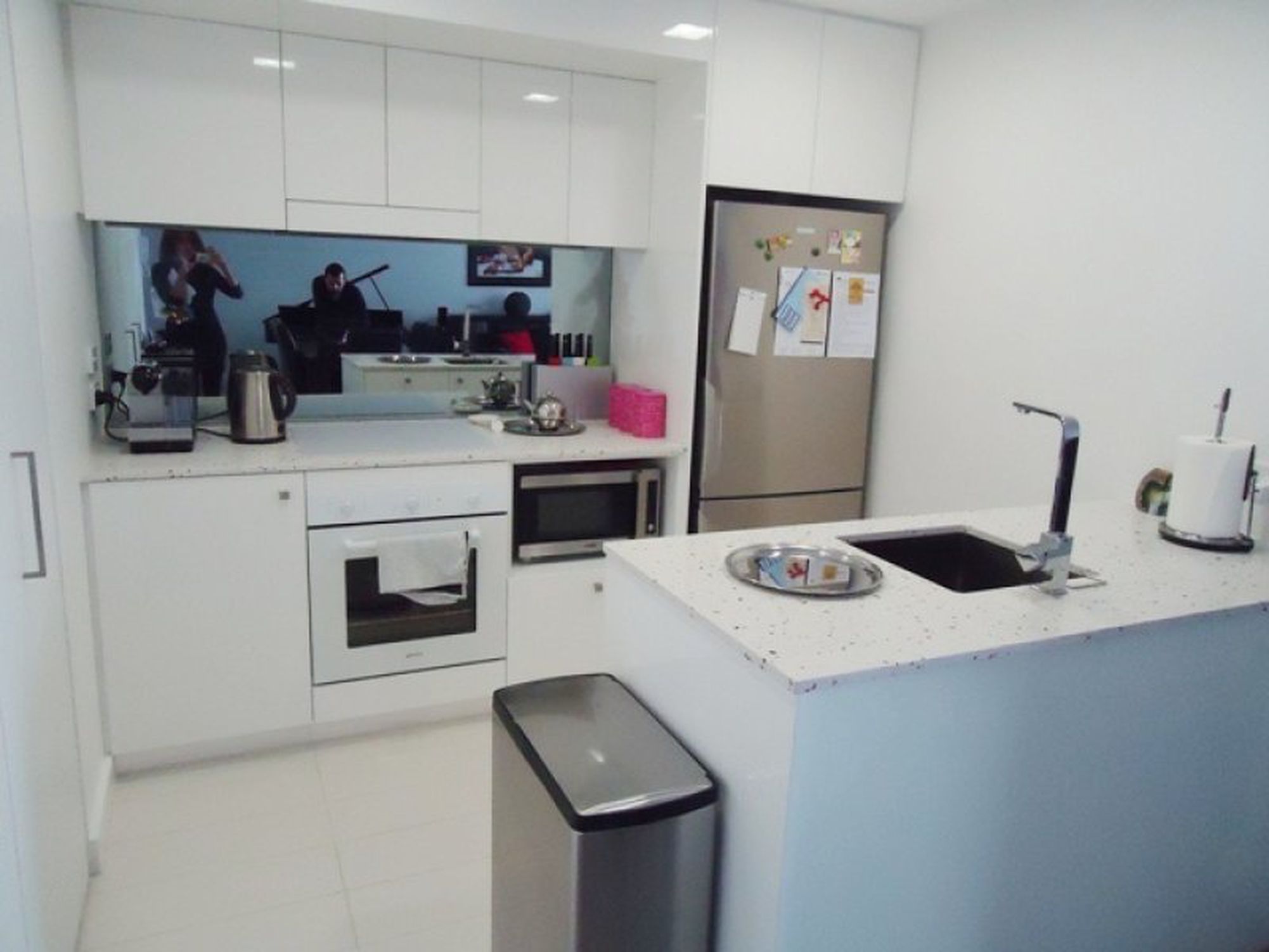 - Contemporary kitchen with stone benchtops and integrated dishwasher