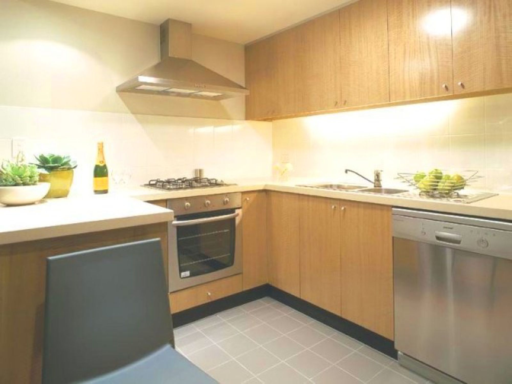 - Contemporary kitchen with stone benchtops and integrated dishwasher (and gas cooking)