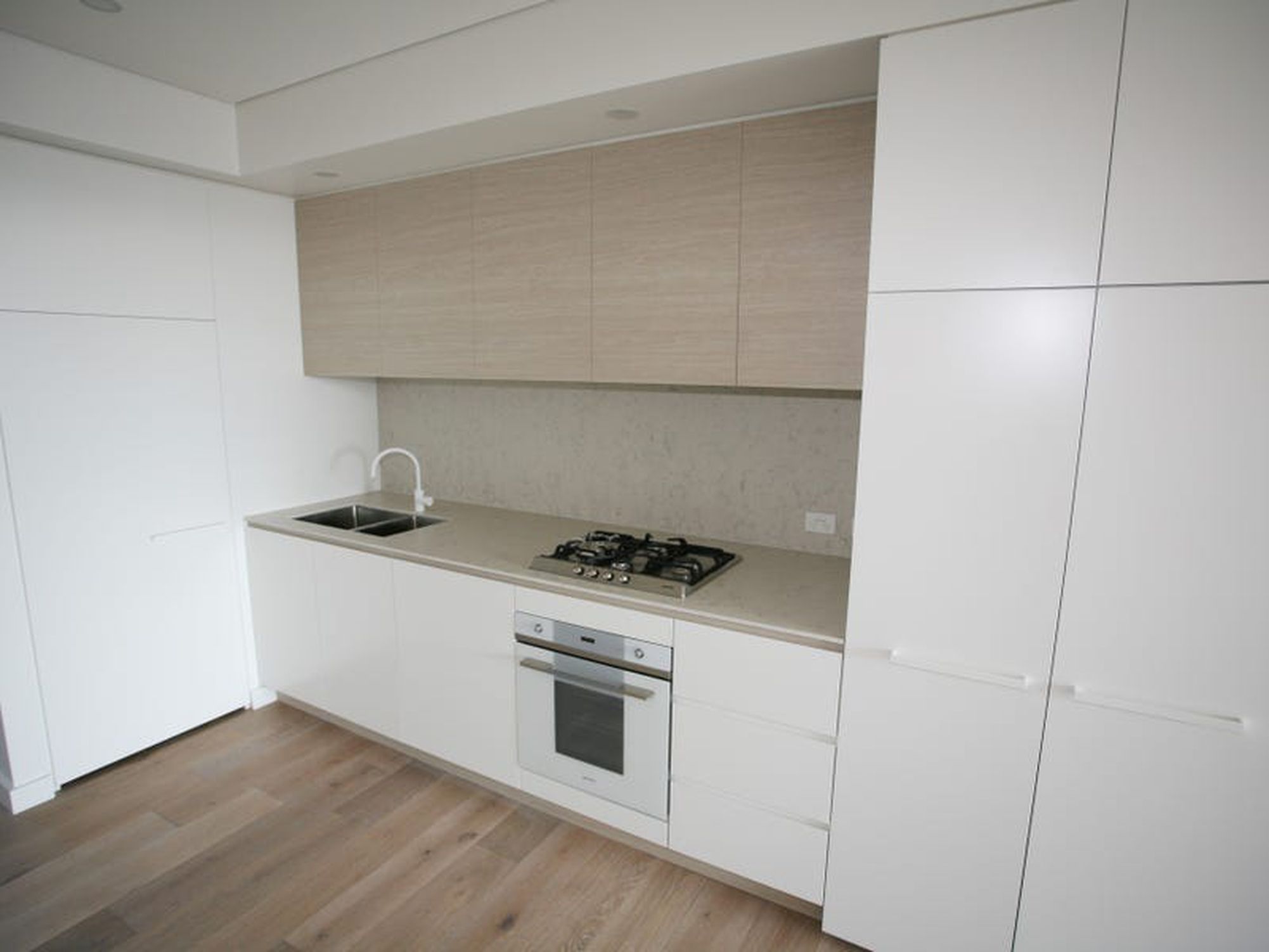 - Contemporary kitchen with stone benchtops and cool neutral coloured decor, integrated dishwasher included