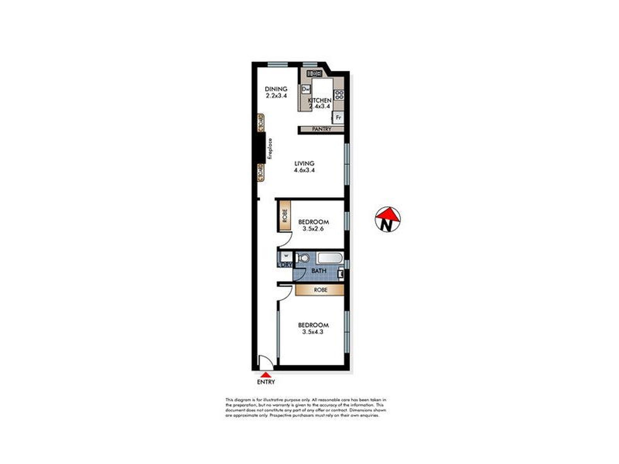 Like a semi in size, this elevated above the street level, 2 bedroom apartment has a well-designed layout featuring an entry hall, living area (with working fireplace), dining area, near new custom-designed Smeg gas kitchen, main king-size bedroom and 2nd double bedroom both with built-in robes, and white-tiled bathroom.