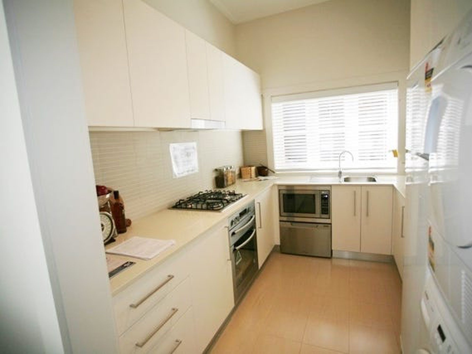 - Designer kitchen with stone bench tops, stainless-steel European appliances, gas cooktop, encompassing fridge, stainless dishwasher and microwave
